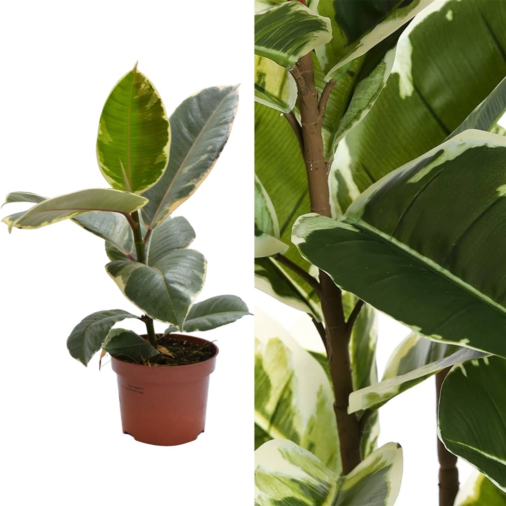 Give life to your environment with a Ficus flower, with many glossy green and cream variegated leaves creates a gorgeous weeping plant to soften any space. Perfect for adding life and structure to your room with the added benefit of helping to purify the air. It doesn't have many needs, as long as you find a bright spot away from direct sunlight, not close to a heat source like a radiator and away from any draughts it will usually be happy. Once it has the right place try not to move it as they don't like being moved around. Water with tepid water when the soil is just starting to dry out on the surface, but don't let it dry out completely. During the winter you can reduce the watering. Mist the leaves in the summer months, and feed with a liquid fertiliser during the growing season.