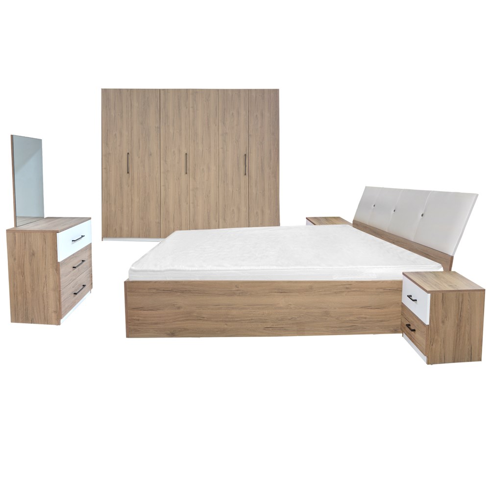 FIORE Bedroom Set is a great, eye catching set for your room. This Bedroom Set offers a stylish storage solution for those working to a budget. This bedroom set has been constructed from melamin has a walnut with cream finish. This Bedroom Set consists of 3 Drawer Chest, 2 Night Table, Bed Frame and 6 Door Wardrobe. FIORE Bedroom Set Wardrobe has six large doors, will open up to a spacious interior that will allow you to easily store and protect your shirts, jackets and other clothing. FIORE Bedroom Set Drawer Chest has 3- main drawers for storing your personal items, and tabletop can be used for placing your TV or home ornaments upon, and is supported on sturdy legs. FIORE Bedroom Set Night Table will serve as a handy pedestal for a lamp and alarm clock whilst the additional drawer space will prove invaluable when it comes to alleviating clutter around the bed. FIORE Bedroom Set Bed Frame is low foot and high headboards with slatted base, offering a good mixture of firm support and sumptuous FIORE. Note: Mattress and Mattress support is not included in wardrove set. FIORE Bedroom with 6 Door Wardrobe Set Features: Dimensions Wardrobe: 242x52xH210 cm Nightstand: 50x40xH45 cm Chest: 90x45xH75 cm (Mirror: 60x76 cm) Bed: 90x170xH207 cm