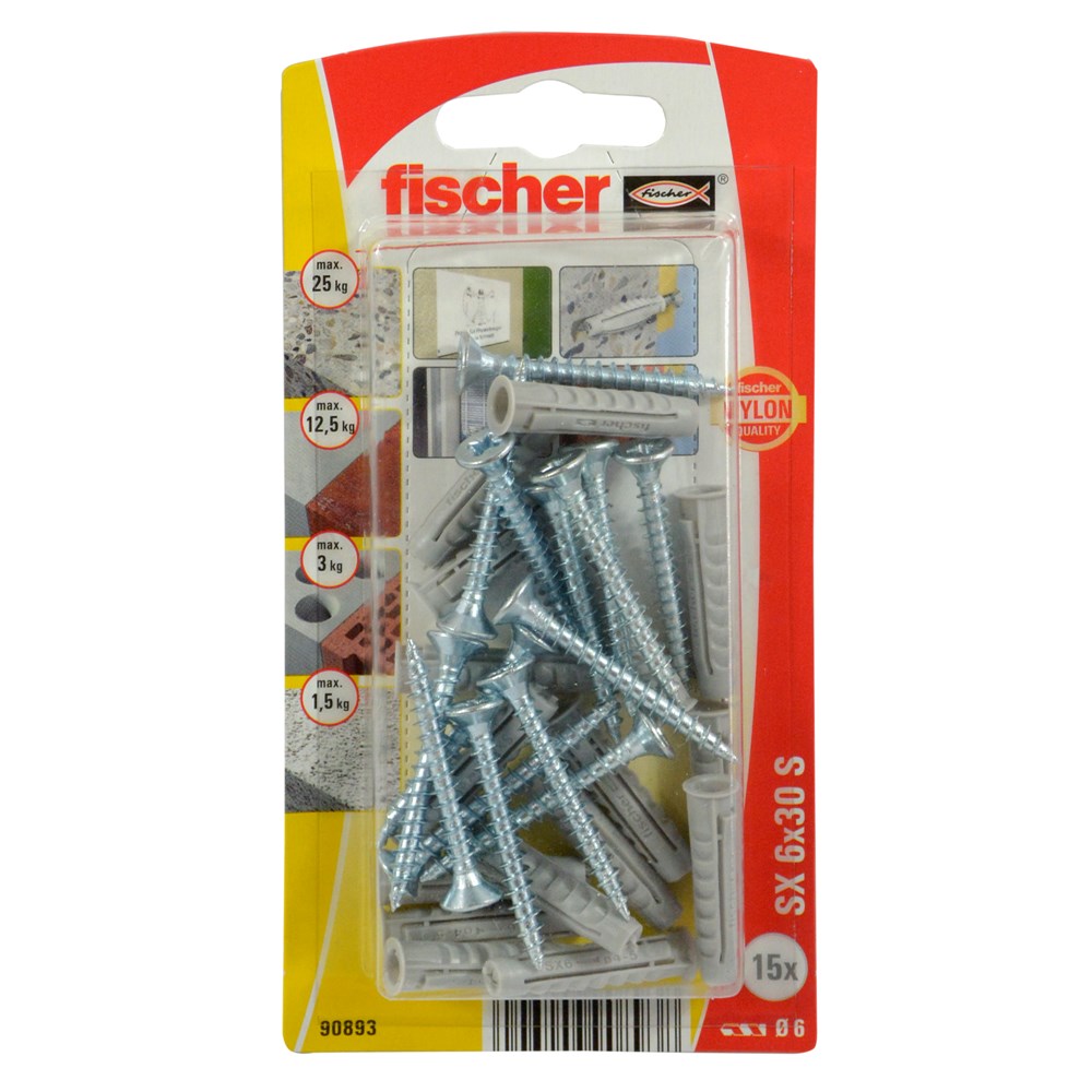Due to four-way expansion, the fischer expansion plug SX optimally transfers forces into the building material. The high-quality nylon used in production and typical expansion guarantee a secure, permanent connection. The edge on the head of the fixing prevents the fixing from slipping into the drill hole. The screws supplied are ideally suited to the fischer expansion plug SX. This guarantees perfect hold with, for example, lights, strips, bath and toilet installations, as well as lightweight wall cupboards.