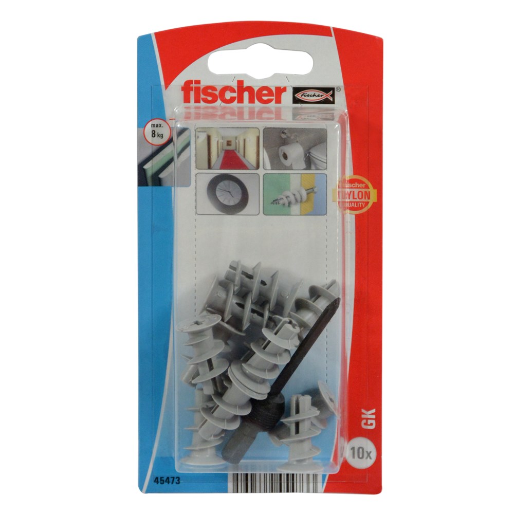 The fischer gypsum plasterboard fixing GK is made of high-quality nylon. When in pre-positioned installation, the plug is screwed in using the setting tool included with a cordless screwdriver so that it is flush to the surface in gypsum plasterboard. No preliminary drilling is necessary for board thicknesses up to 15 mm. The fischer GK can bear wood, sheet metal, and chipboard screws with a diameter of 4 to 5 mm as well as various hooks and eyes. It is therefore universally suitable for quickly and safely mounting pictures, lights, and electrical installations.
