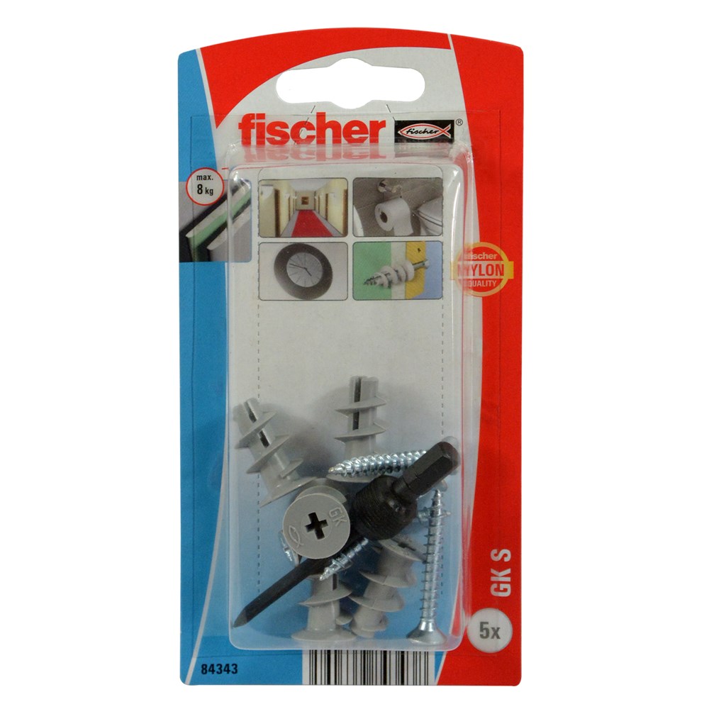 The fischer gypsum plasterboard fixing GKS is made of high-quality nylon. When in pre-positioned installation, the plug is screwed in using the setting tool included with a cordless screwdriver so that it is flush to the surface in gypsum plasterboard. No preliminary drilling is necessary for board thicknesses up to 15 mm. fischer GKS is fully supplied with a chipboard screw. It is therefore suitable for quickly and safely mounting pictures, lights, and electrical installations.
