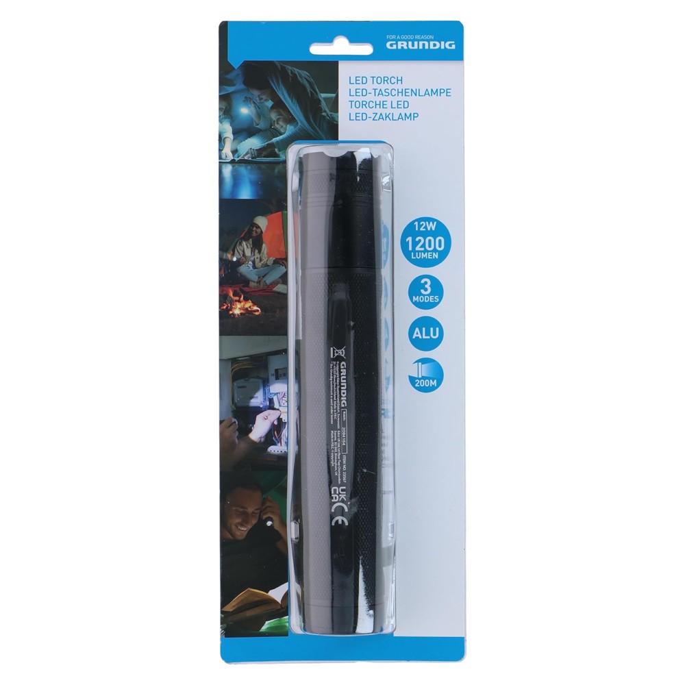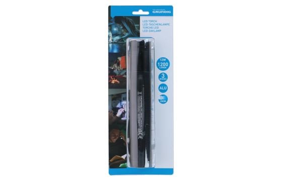 Discover the power of the Grundig LED flashlight with an impressive beam output of 1200 lumens and a range of up to 200 meters. Whether you are camping, taking an evening walk or simply need extra light, the Grundig LED flashlight is always ready. With its compact dimensions of Ø 42.5 x 245 mm, a weight of 426 grams and durable aluminum material, this flashlight is easy to carry. With 9 AA batteries (not included) you can enjoy long-lasting and powerful lighting. The P70 LED technology ensures a bright and efficient light beam. With 12 Watts of power, this flashlight produces an impressive light output of 1200 lumens, allowing you to see up to 200 meters even in the darkest conditions. Choose from three modes - high, low and pulsating - to suit your needs. The high mode offers maximum brightness for optimal visibility, while the low mode saves battery power and is perfect for long-term use. The pulsating mode can come in handy to attract attention in emergency situations. Trust the Grundig LED flashlight for reliable and versatile illumination, wherever your adventure takes you.
