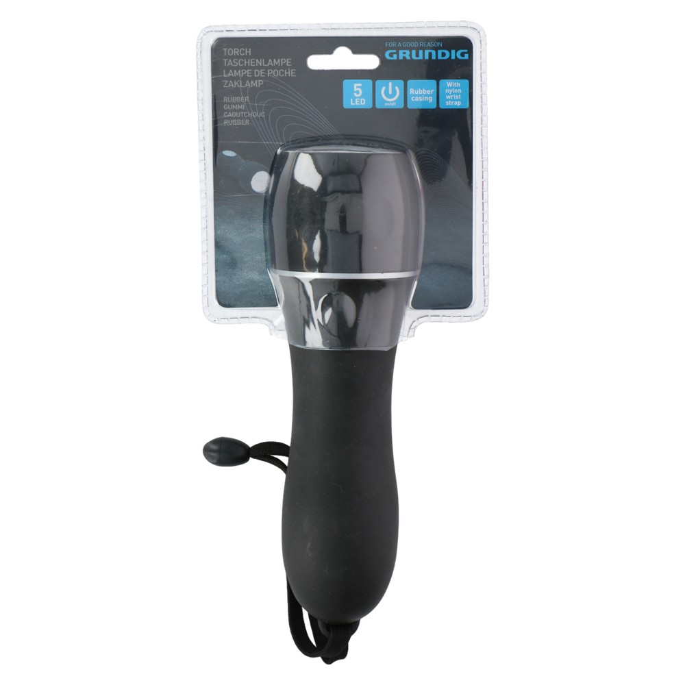 Grundig 5 LED rubber lamp. Rubber end housing. 5 LEDs, wrist strap. Operates with 2 x D batteries (not included).