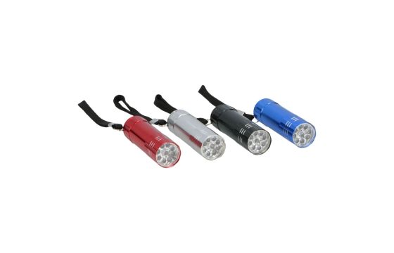 Colored aluminum flashlight with 9-part LED light and carrying strap. Dimensions: 8 x 2.5 centimeters. Including 3 AA batteries.