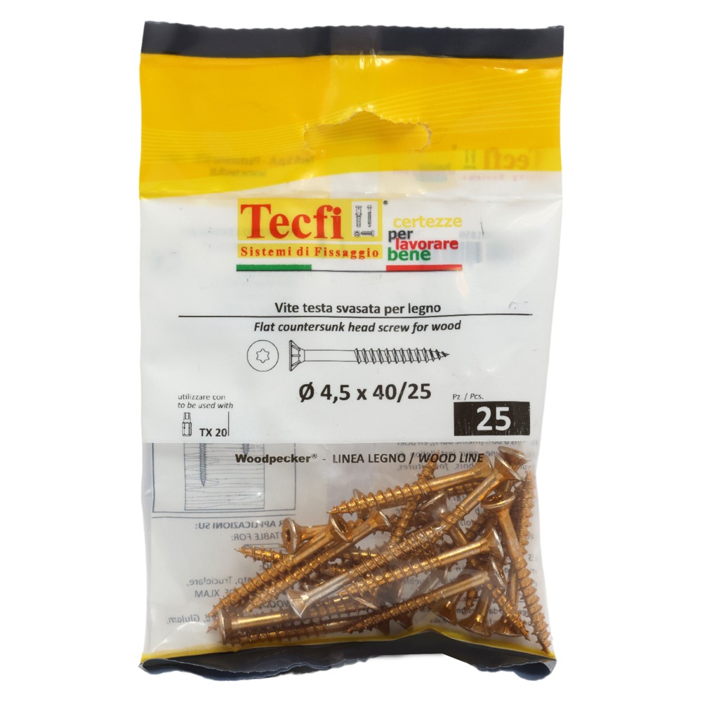 You're reviewing:Flat CSK head torx recess chipboard screw,yellow zp, Ø4,5x40/25mm, Bag 25