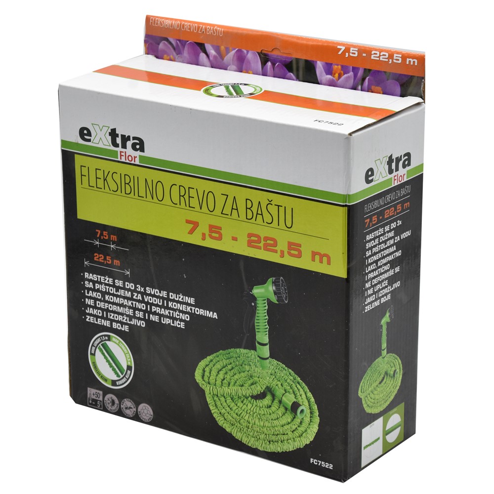 Made of high elasticity materials, capable of extending up to 3 times the initial length. With special clothing for protection against UV degradation and the many cracks that may arise as a result of daily work. Lightweight and easily depositable. With sprayer suitable for many forms of watering during irrigation depending on the position to be irrigated and the type of flower. It also serves best for cleaning various floor surfaces due to the high pressure option. Easily adaptable to standard torque. Ideal for maintaining the garden of your home, business or factory.