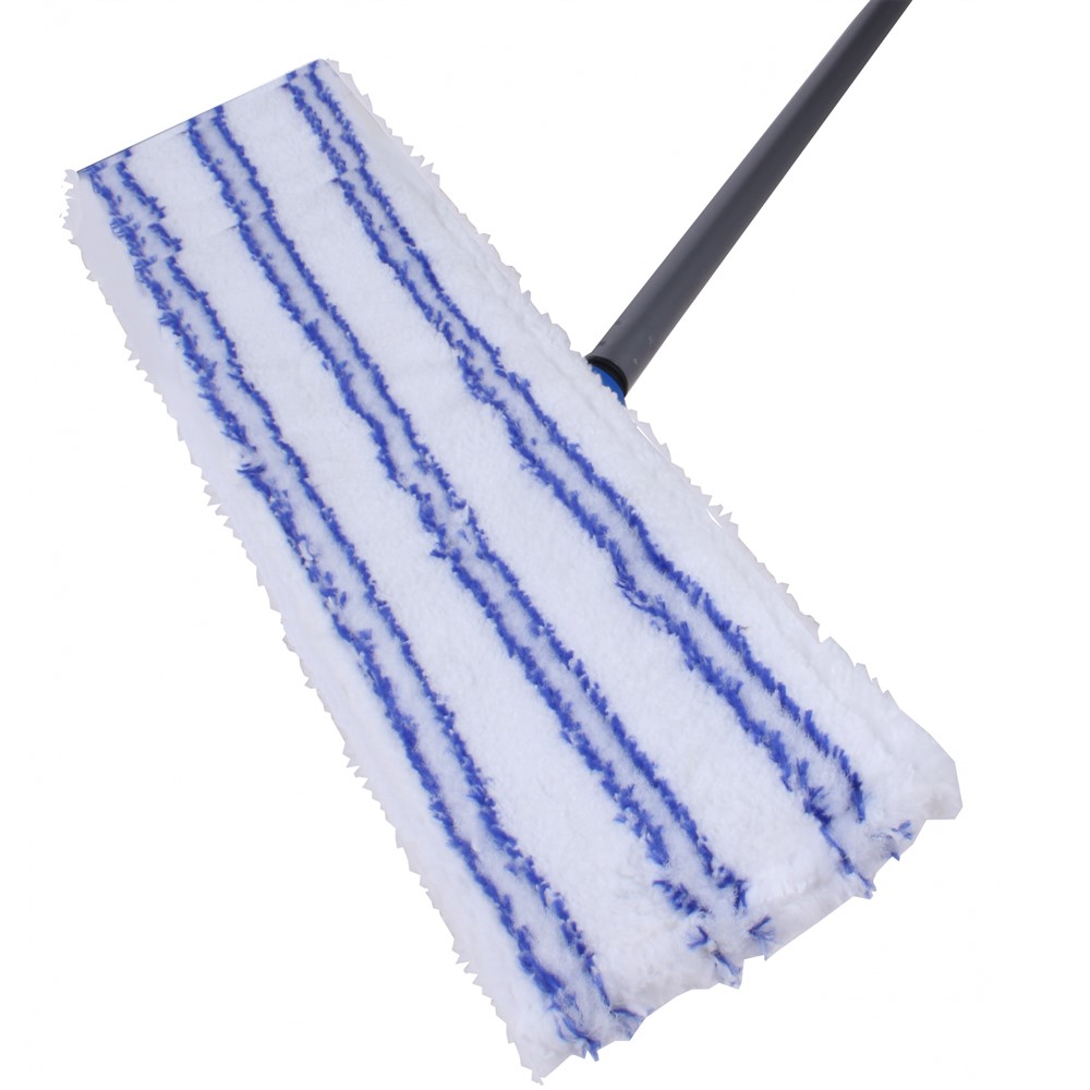 Floor wiper, with microfiber material, in blue and white color. This product reaches the most difficult spots and offers double the cleaning power with its microfibers and special hard fibres.