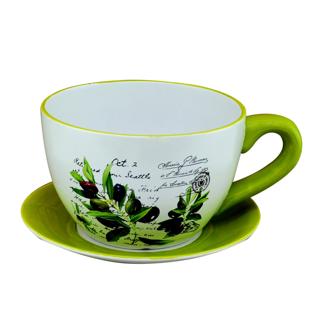 The FLORANCE Ceramic Cup Pot features a fun with stamped olive and bright pattern that can accent any room. The drainage hole prevents over watering while the attached saucer protects your home's surfaces. The modern design compliments a variety of decor styles. Pots can be displayed individually or as a collection.