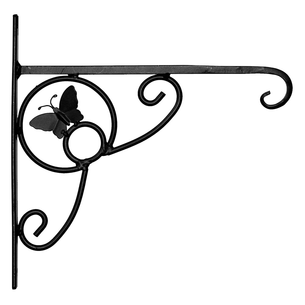 Flowerpot bracket, with butterfly design, made of sturdy steel material, in black color, with dimensions of 28x28.5 cm, which serves as a decorative and functional accessory for various environments. The constituent material is resistant to use, heavy weights, rust or abrasion. It is used to be fixed to the wall and support hanging flowerpots or flower baskets, for decorating professional and non-professional outdoor environments.