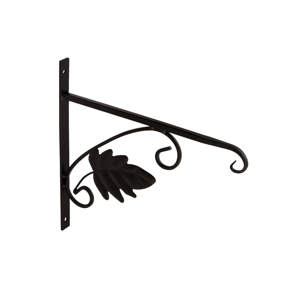 Flowerpot bracket, with leaf design, made of sturdy steel material, in black color, with dimensions of 28x28.5 cm, which serves as a decorative and functional accessory for various environments. The constituent material is resistant to use, heavy weights, rust or abrasion. It is used to be fixed to the wall and support hanging flowerpots or flower baskets, for decorating professional and non-professional outdoor environments.