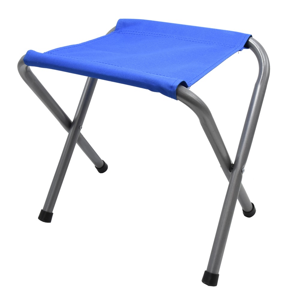 Folding camping stool, with a stable support structure, made of aluminum material, and with upholstery made of textile material. The bench has a seating area of 35x35 cm and a seating height of 40 cm. The metal parts are coated with synthetic epoxy resin material, which is suitable for outdoor environments and protects against rust or blackening. It can be used on camping trips, picnics or on the beach and can be easily transported thanks to its compact dimensions.