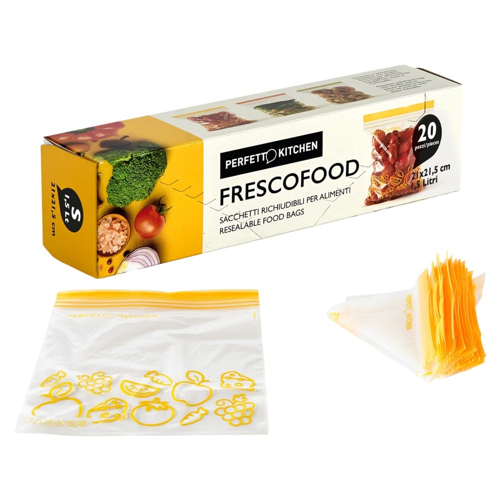 Perfetto Kitchen food storage bag, with a capacity of 1.15 lt, dimensions 21x21.5 cm. The package contains 20 bags, ideal for storing and refreshing food. Strong and practical, it provides excellent protection against moisture and air.