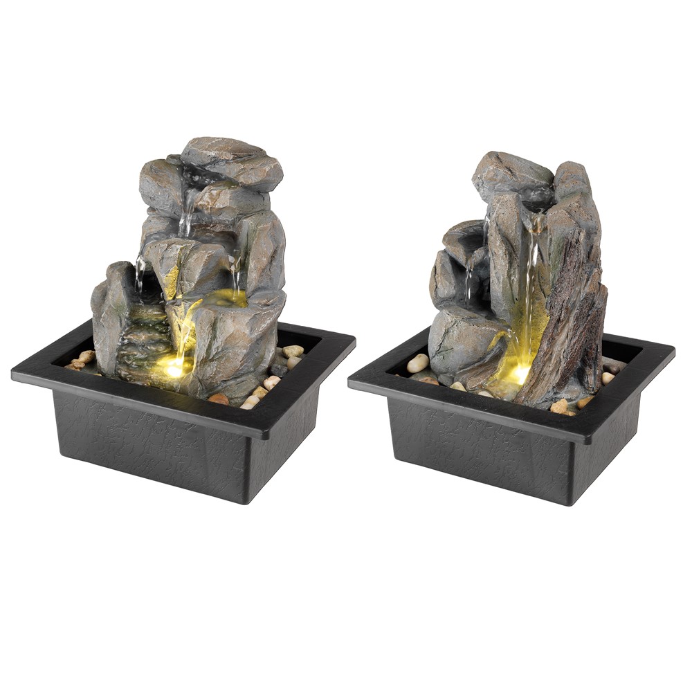 Polyresin fountains , 18.8 X 21.5,H24 cm, gray, with led light. They look like natural stone. To add a relaxing and beautiful element to your environment and to bring nature to you, the solution is this fountain. Can be used indoor or outdoor.