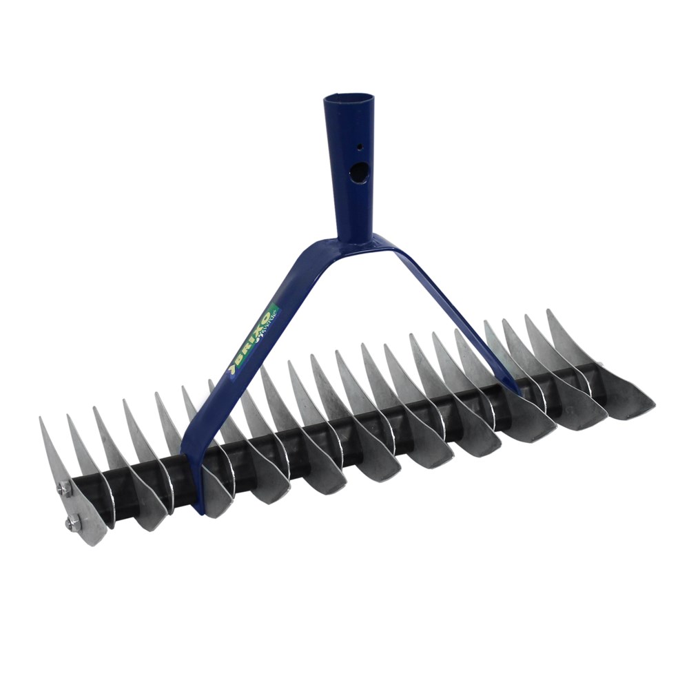 Metal comb for workind on land, with teeth on both sides. The teeth are the different spaces in each of the arm to make it possible spalling clods of earth to earth as well ironed. Material quite resistant and easy to use