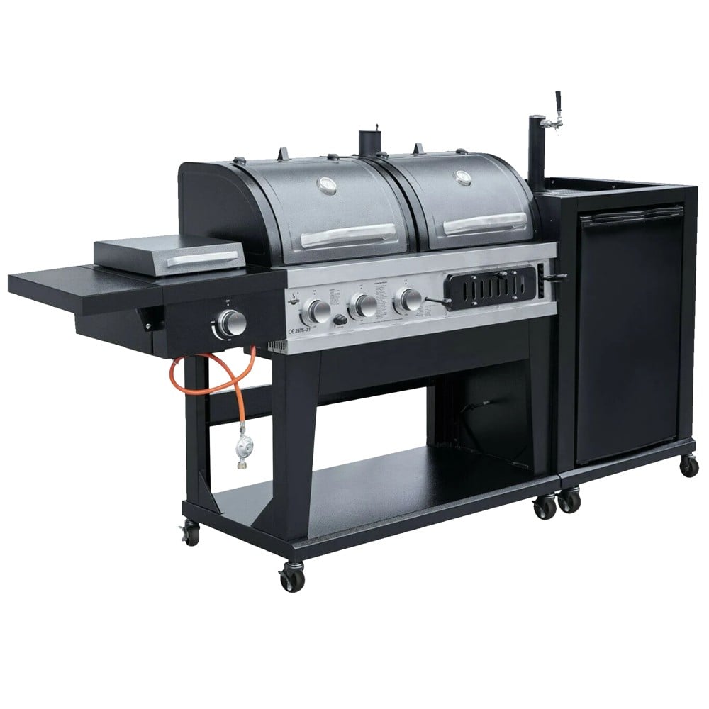 With this combined barbecue you are well prepared for any occasion and any request. Thanks to the triple functionality, you can choose the optimal preparation for each dish and the required cooking method. Especially at large celebrations, this barbecue shines with the cooler and the integrated beer dispenser. You can store and cool beer kegs easily and safely and easily serve beer from the keg - even while grilling. When you use the gas grill you will have several main advantages: convenience and usability. For for example, cooking food can start within minutes. There are three powerful burners, each with 2.93 kW, so that even demanding projects can be easily mastered. The various placement options of this grill allow you to cook any food optimally - for a rich and healthy diet! Charcoal grilling gives your food the classic smoky flavor and a firm crust - a real pleasure! The innovative lever mechanism, with which you can adjust the height of the charcoal pot in 6 steps/levels, instead of having to deal with the hot grill grate, it makes your work much easier and guarantees you much more fun in grilling! The air supply can be adjusted via two air covers (1x front, 1x side), which are easily controlled via separate levers on the front. Gas and charcoal barbecues are equipped with thick cast iron grills, which in order