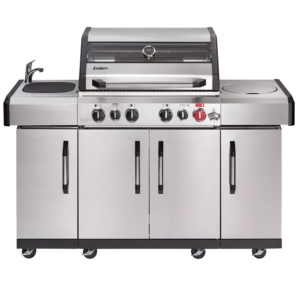 Gas barbecue Enders Kansas II Pro, made of stainless steel material, rectangular shape, with wheels, lid with handle, two side tables, for placing cooking equipment, food and other accessories and with holder on the bottom. The barbecue has four burners and six rotary knobs, which allow adjustment to the right cooking temperature. Features: 800°C turbo zone with infrared grid reaches very high, fast and hot temperatures. It has a heat range that manages to keep you at a constant temperature for low and high temperature cooking. The cooking grid with switch is made of enameled cast iron which has multiple cooking options. On one side of the barbecue is the space to clean the dishes used during cooking. while on the other side is one of the cooking stoves. This barbecue has a large stainless steel lid with a built-in thermometer. All the internal parts of the barbecue, the side shelves and their doors are made of stainless steel material. It is used for roasting meat, vegetables, fish, etc. It has a total power of 22.3 kW. This product is practical to use, easy to clean.