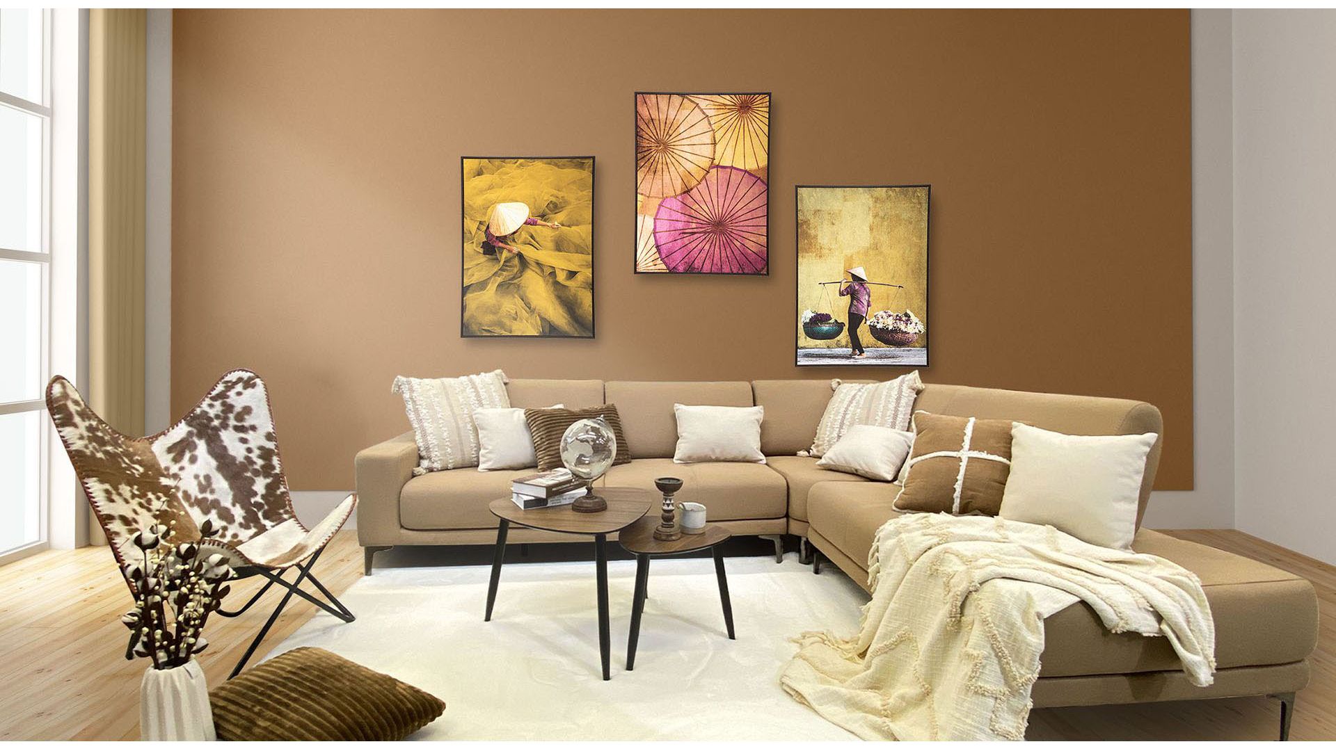 Golden Feelings - An environment that gives a feeling of warmth and comfort in every detail through the neutral colors of the earth, beautifully combined with natural textures. To create a color contrast and add some "adventure" shades, you can choose between printed canvases.