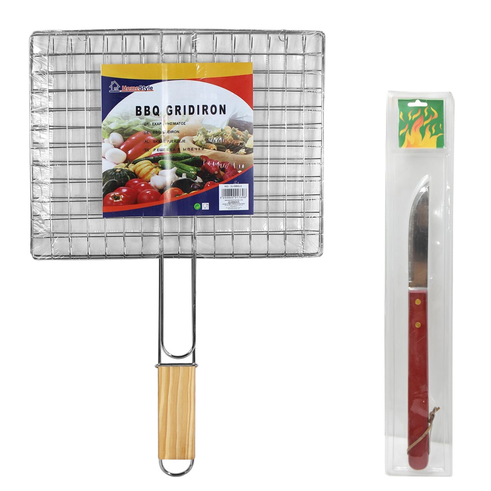 Barbecue cooking set, which contains a barbecue grill, with dimensions of 36.5x28x56.5 cm, equipped with a wooden handle, as well as a knife.