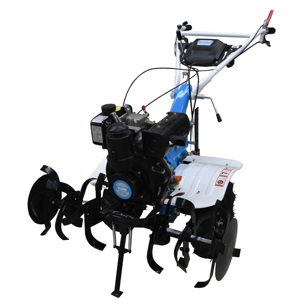 Produced from high quality materials and designed with the main focus on high functionality during tillage. With diesel engine of 179 cc and maximum power of 4.8 KW. Powerful torque in conjunction with the 3-speed transmission, enables a uniform, stable transmission of power and maximum traction in the lower gears. Motor power and increased transmission connections make it possible to work the soil up to 10 cm deep, with edges up to 1 m wide. Low speed, facilitates work and increases the level of safety when running the milling machine. Maintenance is simple thanks to the resistant diesel engine. Cooling is performed by air, the transmission works thanks to the lubrication with SAE 140W gearbox oil. The engine needs lubricant such as: 15W40. Other aggregates can be mounted on the milling machine: plow for tillage / three-ton trailer up to 500kg / plug for opening canals / cultivator / and water pump.