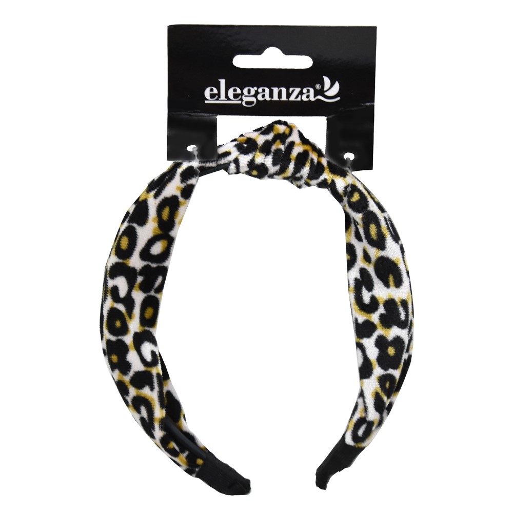 Hair band, with ribbon decoration, with a structure made of plastic material and synthetic velvet coating, in different colors, with Leopard design. It can be used for fixing and styling the hair, it has a constituent material which does not cause friction or breakage of hair strands and it is lightweight and water resistant. This product is suitable for non-professional use.