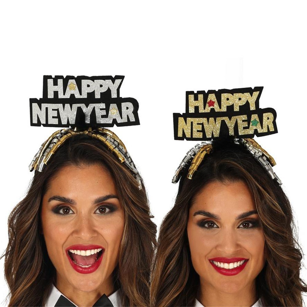 Around the head Happy New Year, made of cardboard material, in silver color. Used on New Year's Eve by children and adults.