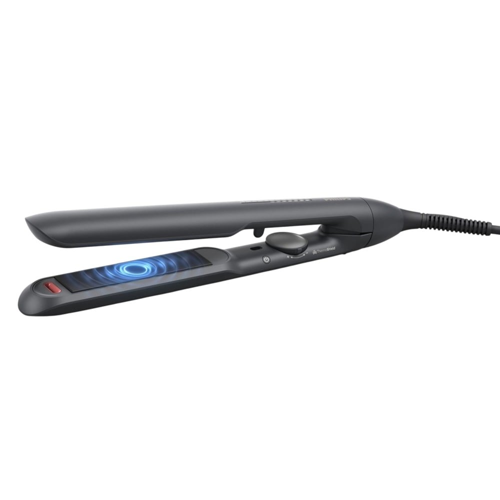 With the BHS510/00, you'll be able to achieve salon-level, perfectly straight hair at home. The smooth plates of the hair iron glide easily over your hair, giving you the best results in less time. ThermoShield technology protects hair ends from burning and splitting. The smooth ceramic plates enriched with argan oil and the sophisticated design will make straightening your hair even easier, saving you time and energy. Ionic care for shiny hair - charged negative ions heal and soften hair, adding natural shine. HS510/00 has 12 temperature settings up to a maximum of 230°C, controlled by LED indicator and regulator. The function of temperature locking and automatic shutdown after 30 minutes guarantees your safety. The device has a quick heating function and is ready for use in 30 seconds. The hair iron has a 1.8m long rotating cord and a hanger that makes it more convenient and practical to use. Also included in the set is a heat-resistant cover.