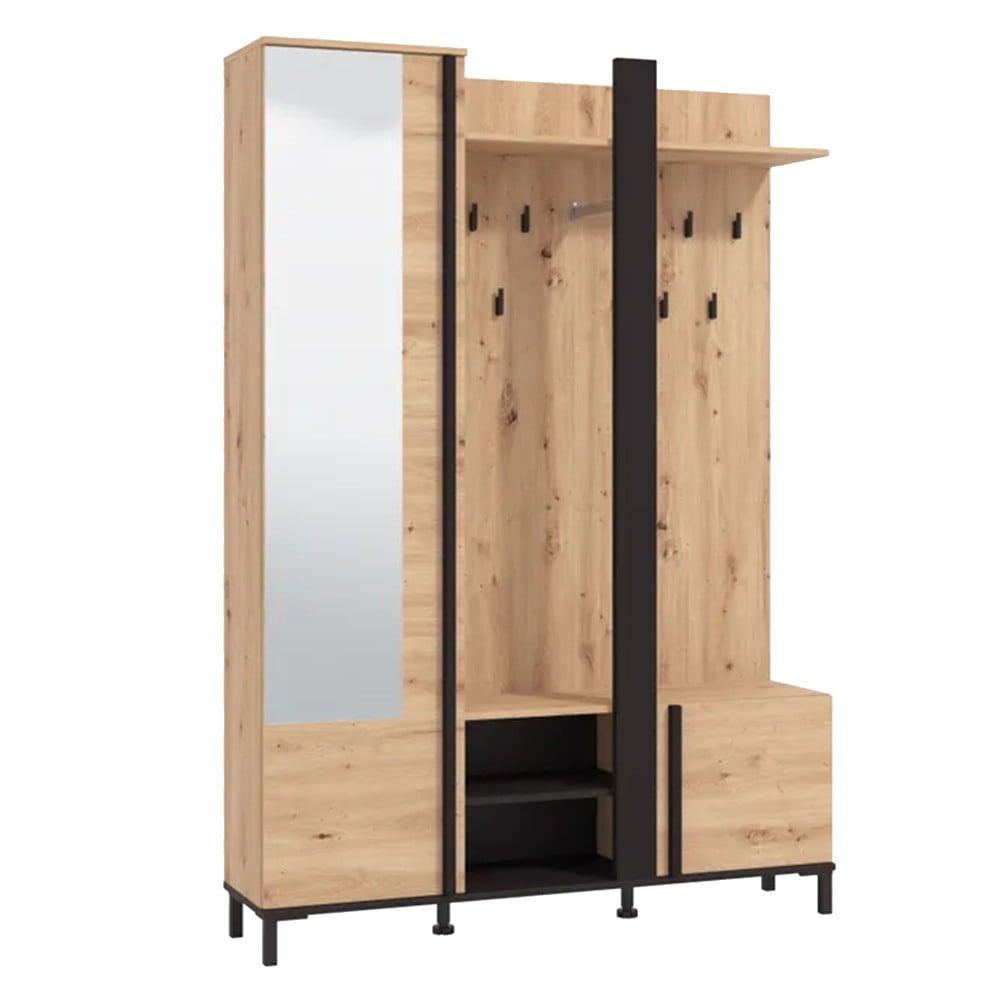 The Nino hallway furniture is a modern and functional solution for organizing your entrance space. Made of melamine with a combination of natural and black colors, which gives the environment an elegant and contemporary look. With dimensions of 134.5x34.5xH192.5 cm, this furniture offers ample space for storing shoes, clothes and various accessories, making your hallway organized and tidy. Its minimalist and modern design makes it suitable for any furnishing style, making this furniture an excellent choice for your home.