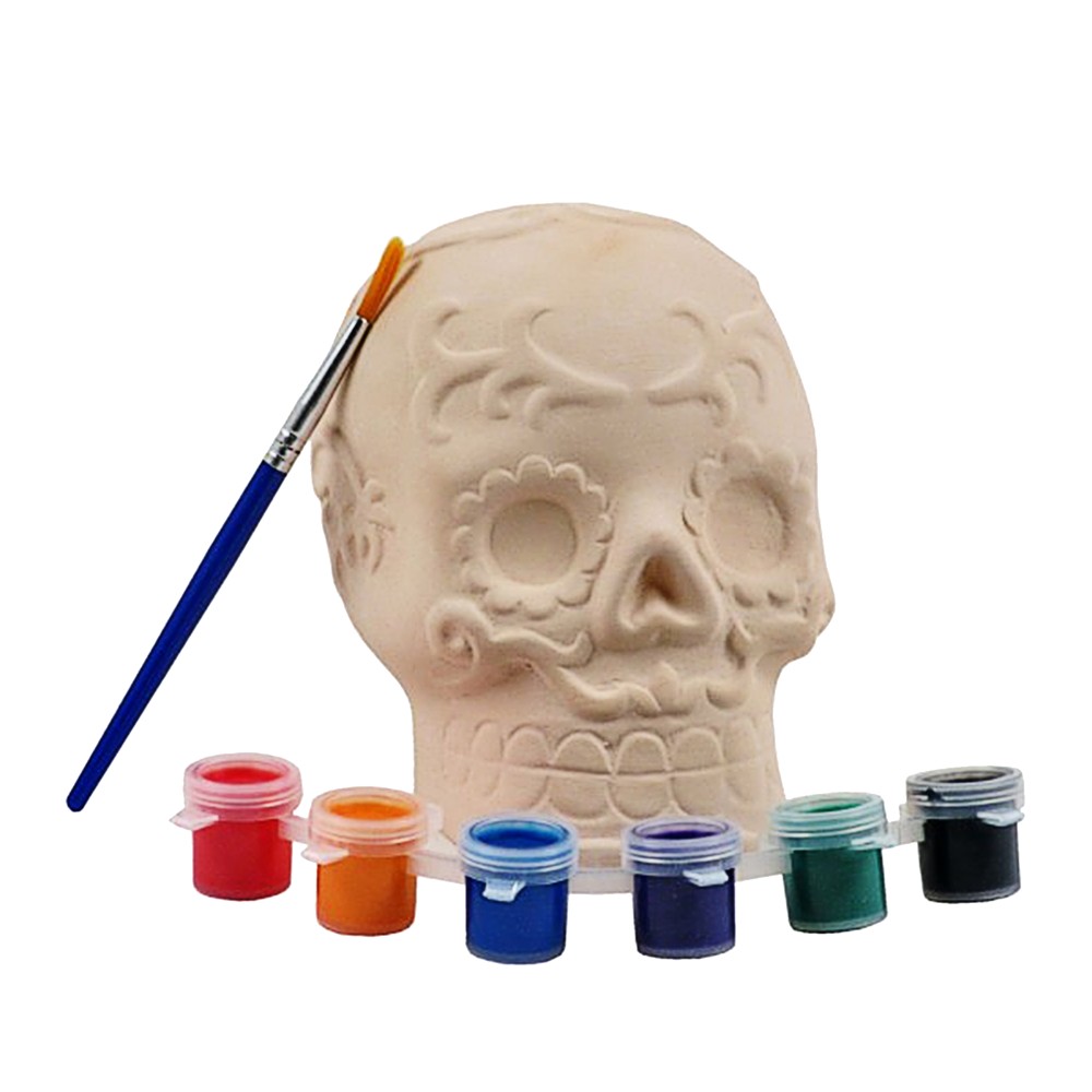 Coloring set, which contains six colors and a skull for coloring. It has a size of 10x10x10 cm, and is made of ceramic material. After coloring, it can be used as a Halloween decoration.