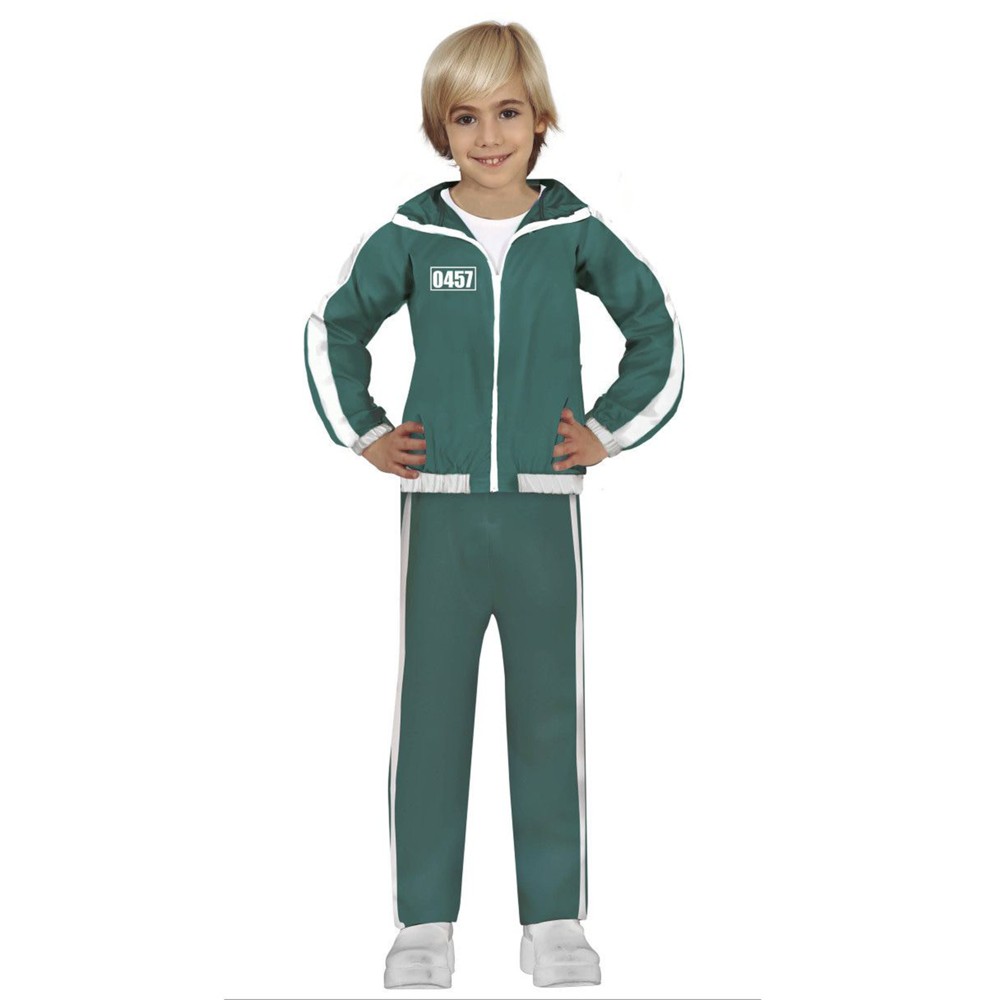 Squid Game Player costume for children, made of polyester material, in green color. The component material is soft to the touch and does not cause skin irritation. This product is suitable for use by children aged 5-6 years, with a height of 110 to 115 cm.