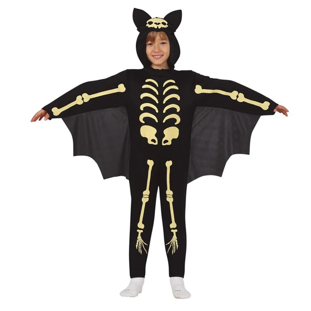 The skeleton bat costume for babies consists of a jumpsuit with wings and a hat. The baby skeleton jumpsuit is mostly black but has white bones printed on it. The wings and the hat make it an extraordinary bat costume for babies. With this Halloween jumpsuit, little bats can enjoy their first Halloween carefree!