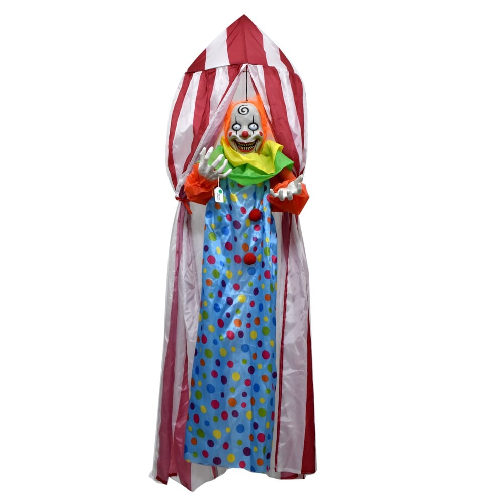 Circus clown halloween hanging decoration, size 190 cm and mixed color. This decorator is battery operated and emits lights and sounds when someone walks by.