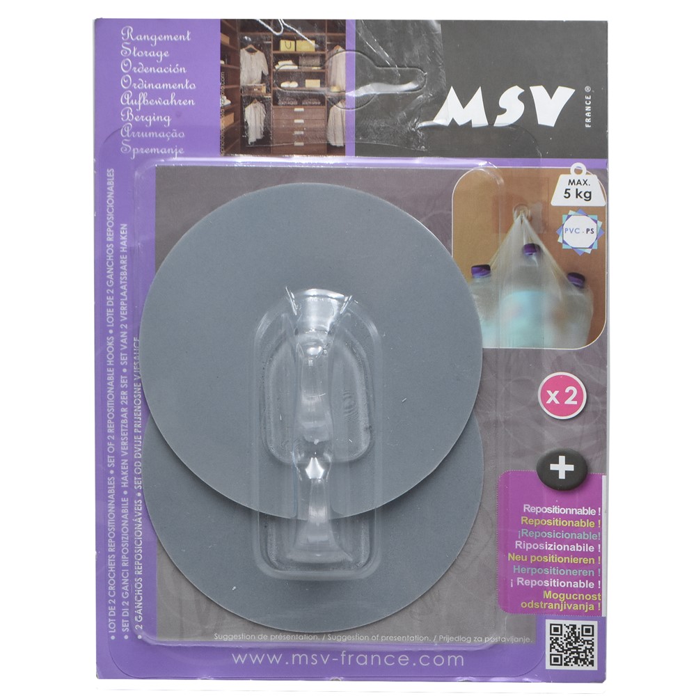 Clothes hangers, made of pvc/polypropylene, in gray color. The hanger is equipped with a clothesline hook and an adhesive mounting system, which allows it to be placed on all types of non-porous flat surfaces, including glass, mirror or tile surfaces, without the need for pierce the wall. Used to hold towels, shower sponges and clothes in the toilets or to hold napkins, cooking aprons and other accessories in the kitchen. This product is suitable for use in professional and non-professional environments.