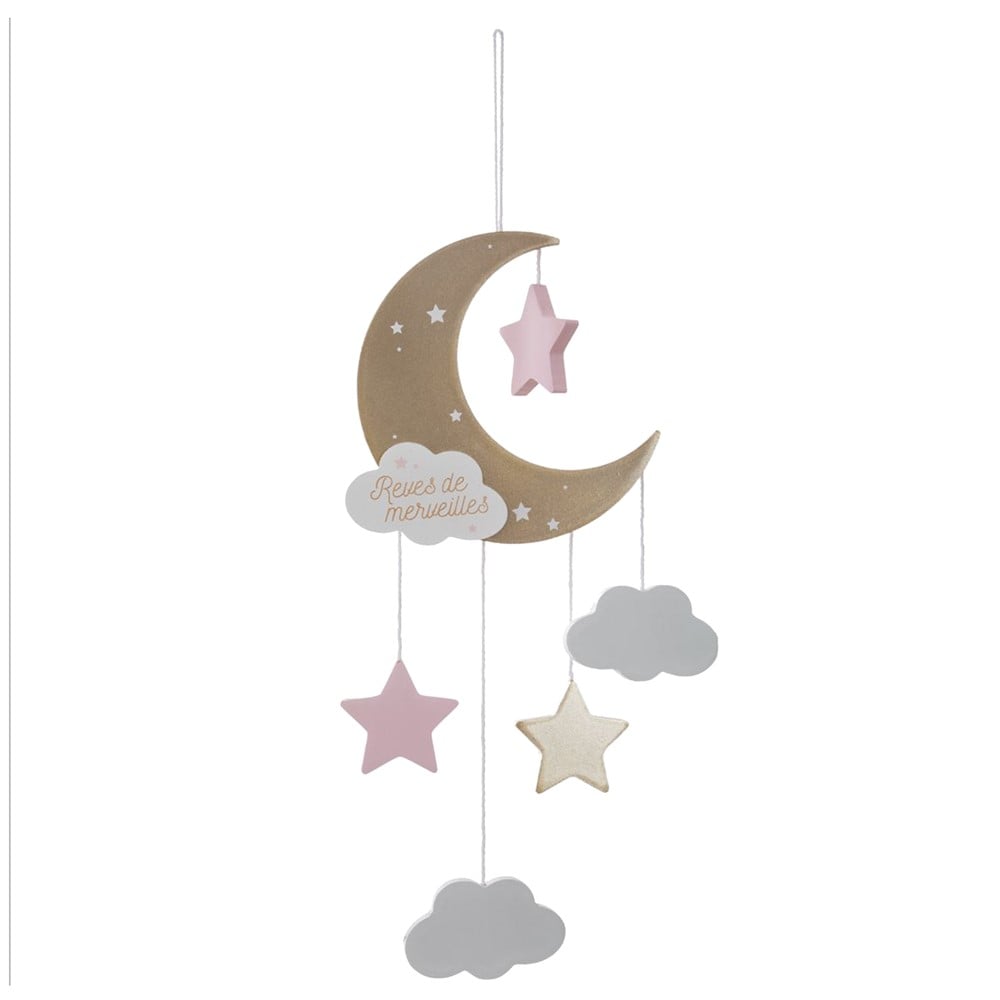 Hanging decoration for children's room in the shape of the moon. Its length reaches 43 cm. The decoration consists of a moon-shaped decor, attached to it a small cloud shape, and hanging are 2 clouds and 2 stars in light pastel colors.