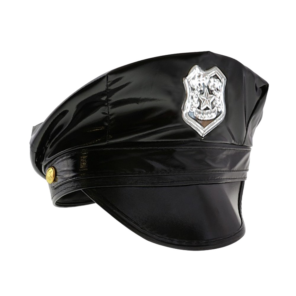 English police hat in black fabric with shiny and rigid black pvc visor. Police emblem in silver pvc applied in the central part and adhesive band with black and white squares on the circumference of the hat. One size fits all for adults.