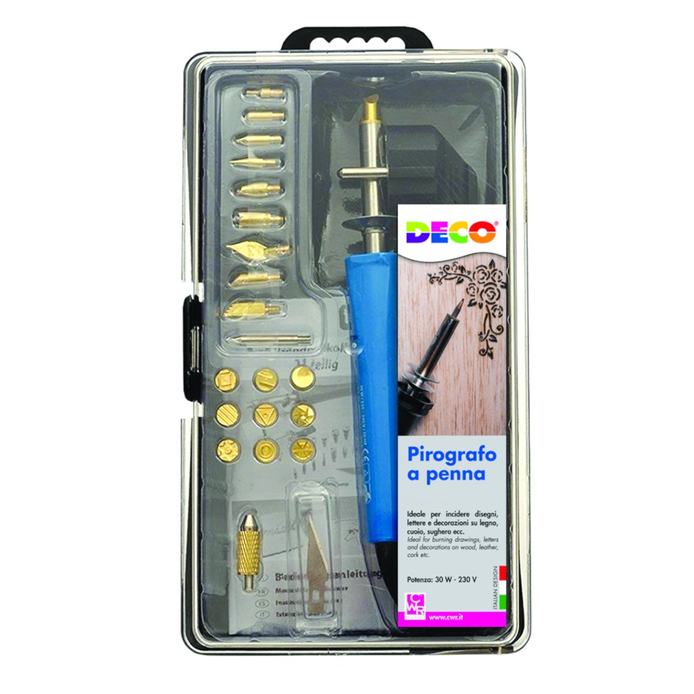 Pyrography with tips. The ideal accessory for creating personalized objects. Engraves on wood, leather, cork, etc. With the 22 different tips you can free your imagination.