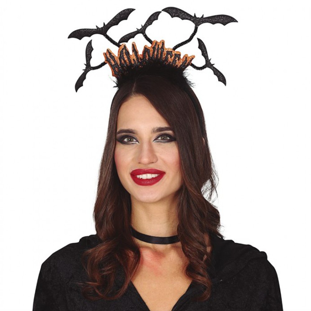 Headband, made of nylon material, in black and orange color, decorated with bats. It is used as an accessory for various Halloween outfits.