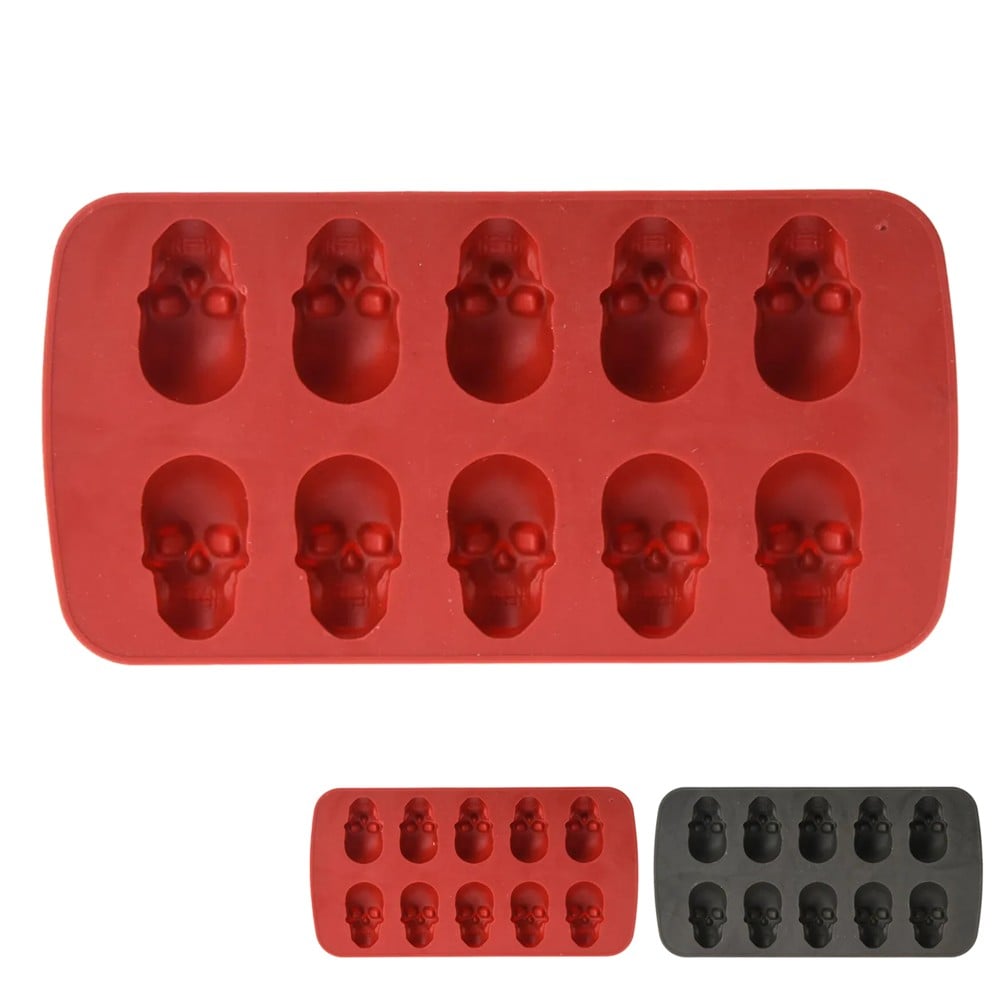 Ice molds made of silicone material, with the shape of skulls. It has a size of 21.5x11x2 cm, and comes in black and red. Used for Halloween.