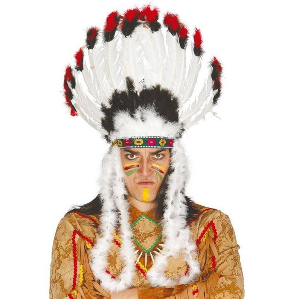 Around the Indian head, with natural feathers mounted around the head, in white combined with red and black, the material consists of feathers of non-textile material of animal origin.