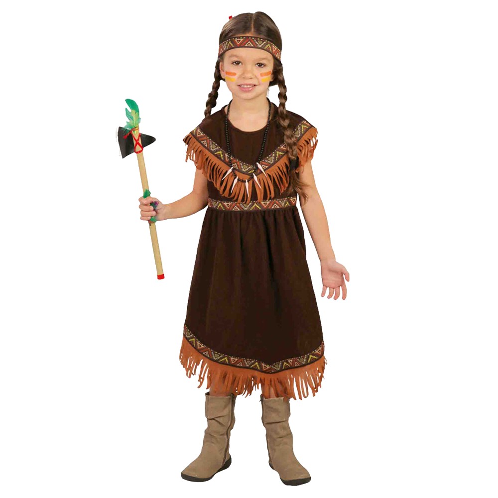 "Women's suit, made of polyester material, in brown color. The dress includes: brown dress with fringe with mosaic embroidery and headband. Necklace, feather, shoes and weapons are not included. Age 4-6 years "