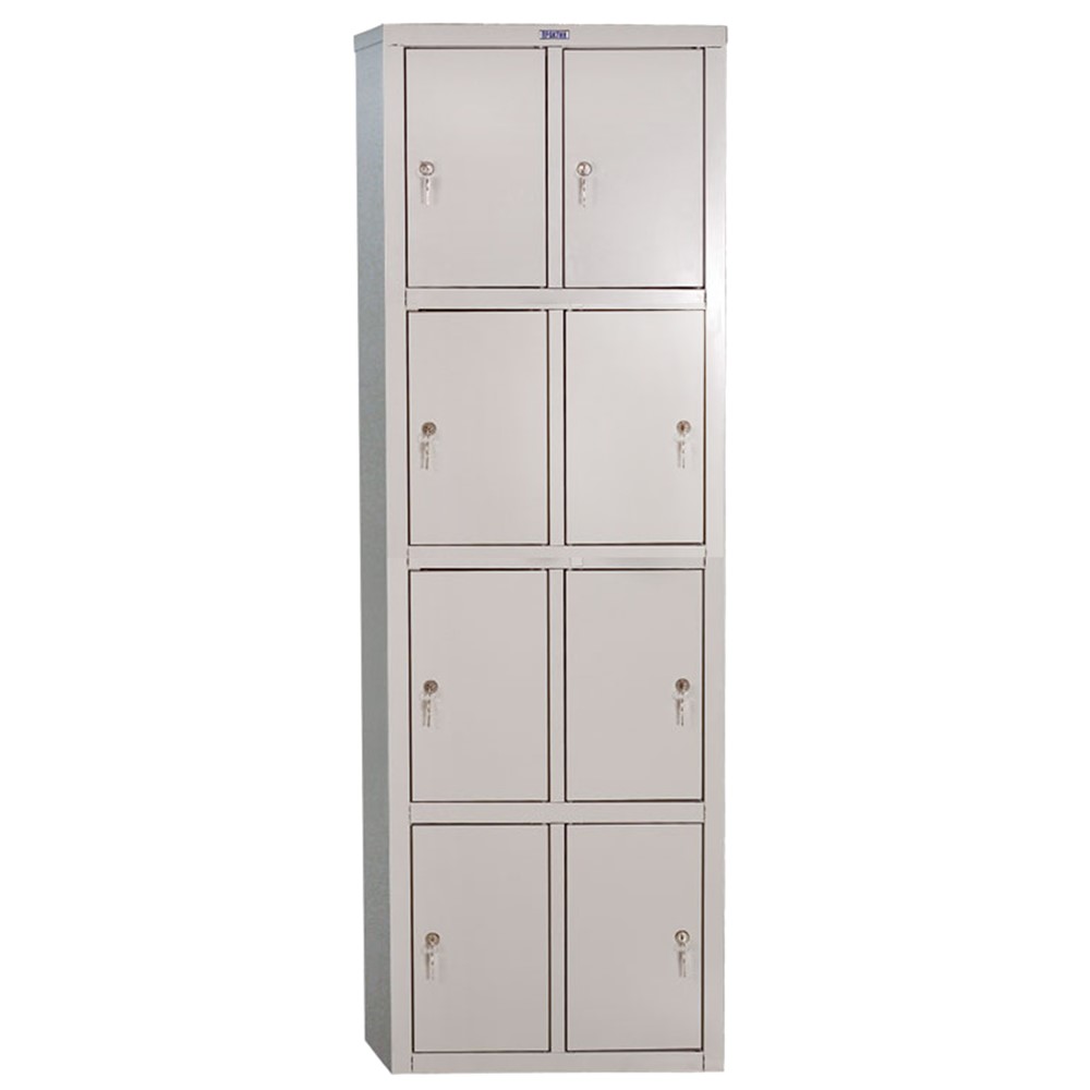 Cabinet metallic work clothes. This metal cupboard with 8 doors (separate space) with fixed shelves for work clothes. You can use it to store different clothes, personal items, documents, etc. Helps you organize the various materials you have at work. Baking coated steel material in gray Ral 7038. Shock and corrosion resistant