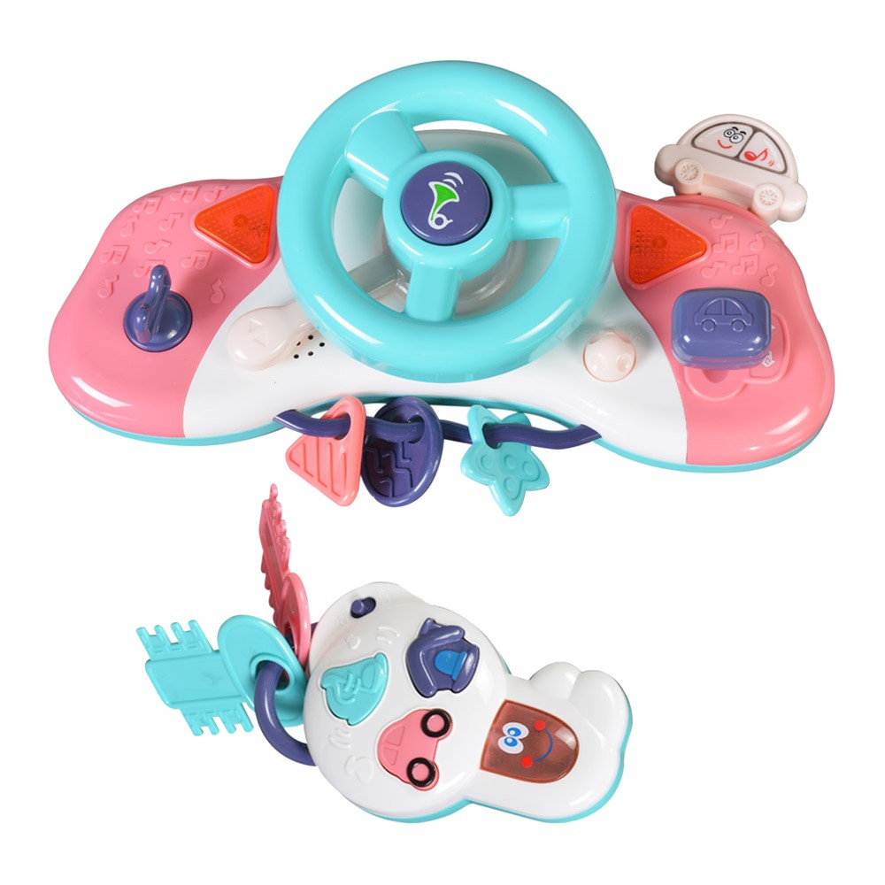 Interactive toy set for children, which includes a steering wheel with music and lights and a pair of keys with keychain, made of plastic material, in a colorful design. The keys are fitted with soft rubber coating, which is suitable for use by small children for biting, during the period of teething. The set can be used by children for play, it stimulates the visual and auditory perception of the child and it contributes to the easier recognition of different shapes and colors. This product is suitable for children over 12 months.