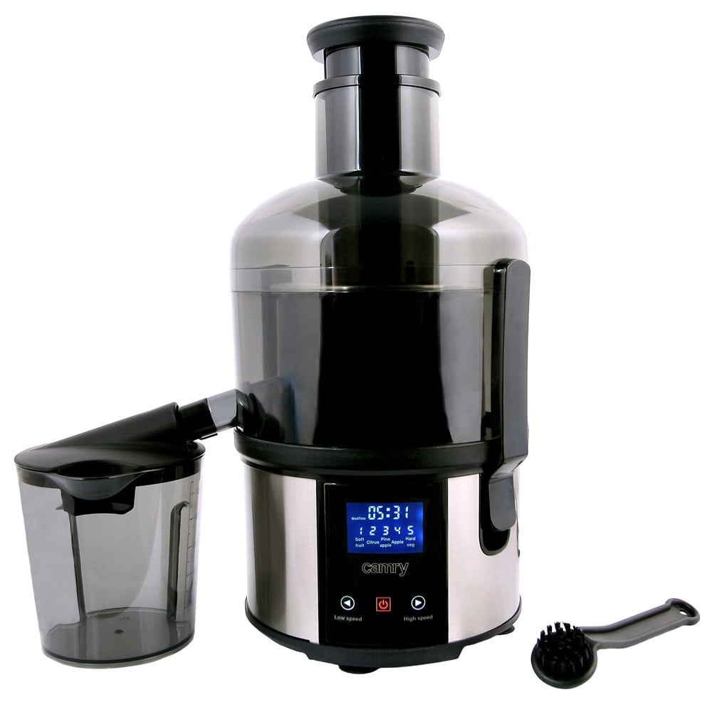 Electric fruit juicer, made of metal and plastic material, with 5 different speed levels, with 5000-10000 r/min, which operates with a power of 800 W. The juicer has a capacity of 1 liter and is equipped with LCD screen and touchscreen buttons. The fruit juicer can be used for squeezing fruits or vegetables to prepare various juices or sauces. This product is suitable for use in non-professional environments.