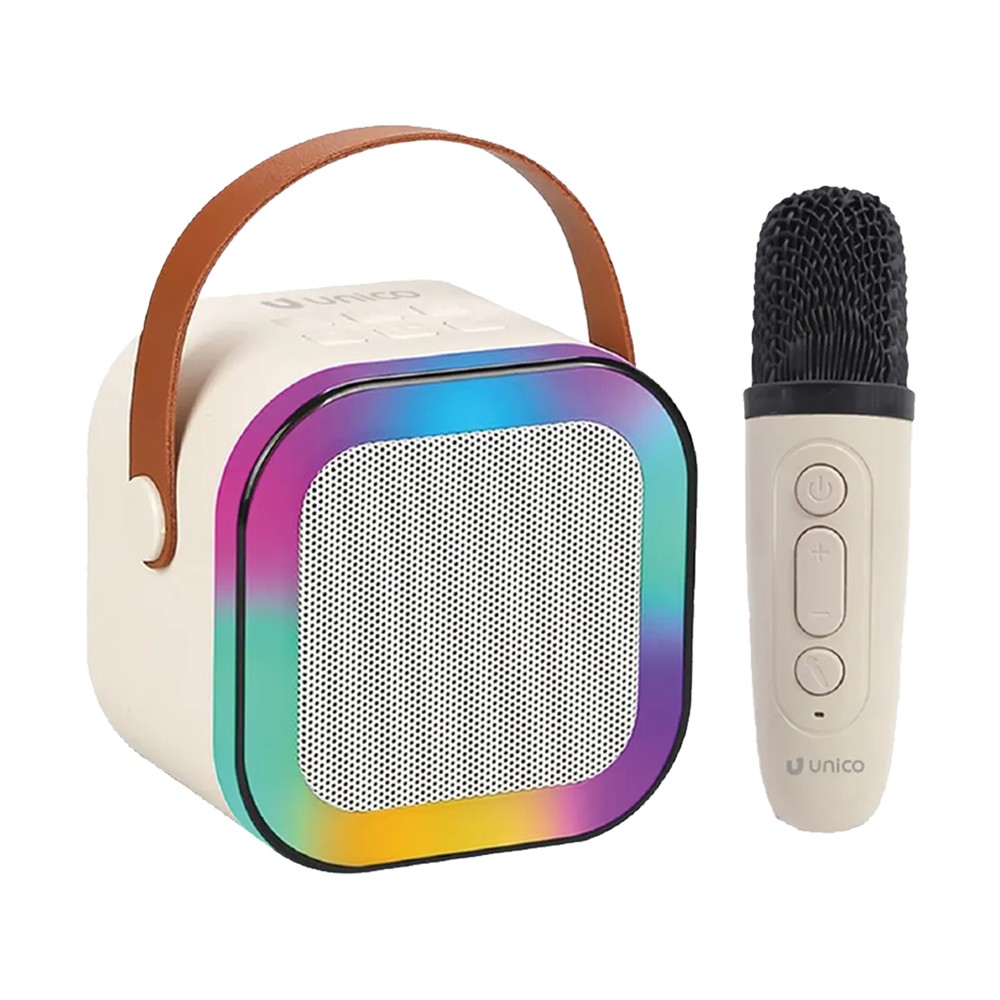 The Unico BS2768 karaoke set is the perfect solution for unlimited fun at home, parties or gatherings with friends. With a compact 86x86x60 mm box and included microphone, it allows you to start your musical performance right away. With 3W power and 400mAh battery, it offers clear sound and long use, while the RGB light creates a lively and festive atmosphere that makes every song more exciting. The modern and easy-to-use design makes the Unico BS2768 an ideal accessory for amateur and professional singers, bringing instant fun and positive energy wherever you are.