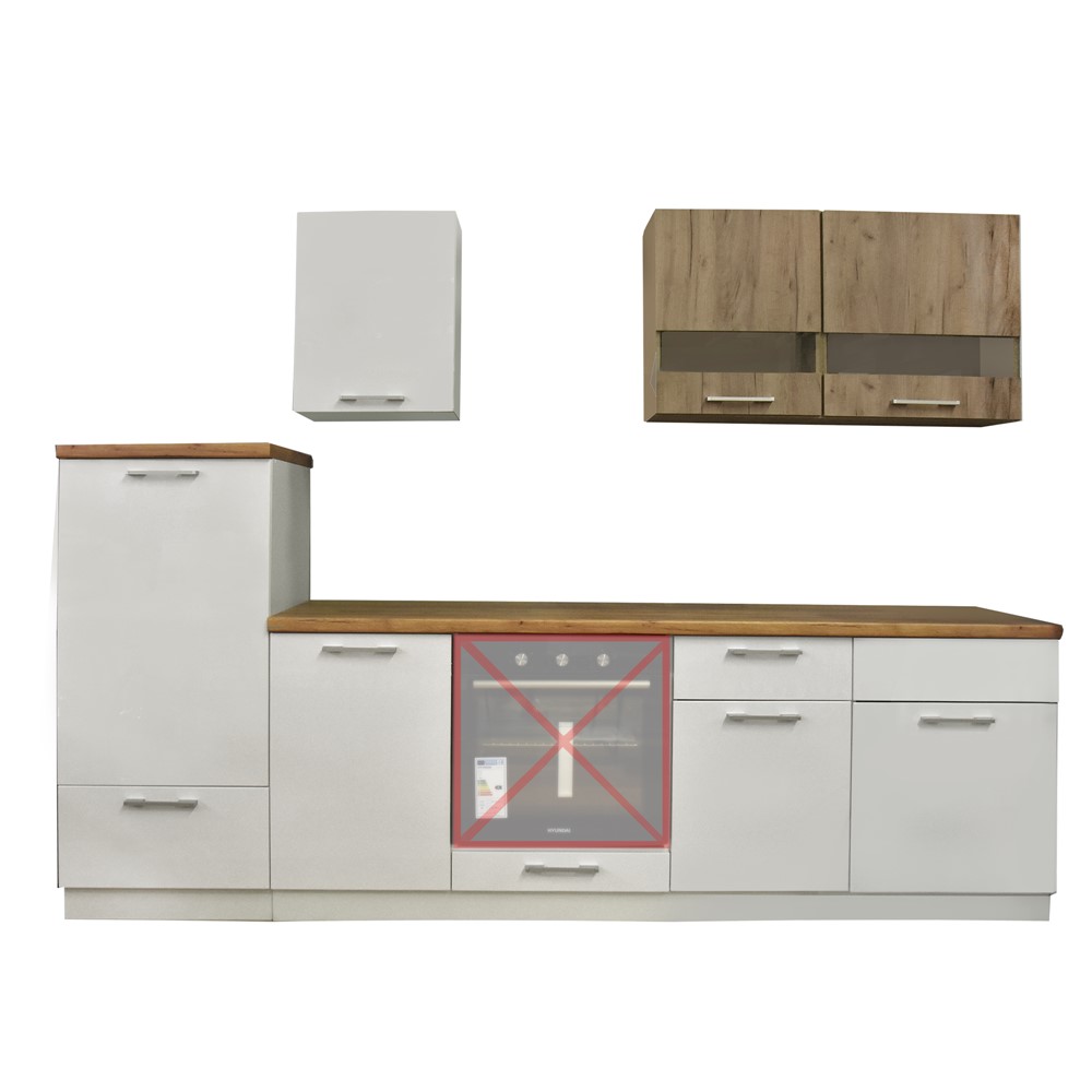 Bianca kitchen, with golden oak color, and an adequate combination of lower and upper elements with the part made of tempered sandblasted glass, will fit perfectly a variety of ambient arrangements. It brings plenty of space for favorite dishes and everything that no housewife would give up. The lower element contributes to additional functionality with the additional storage.
