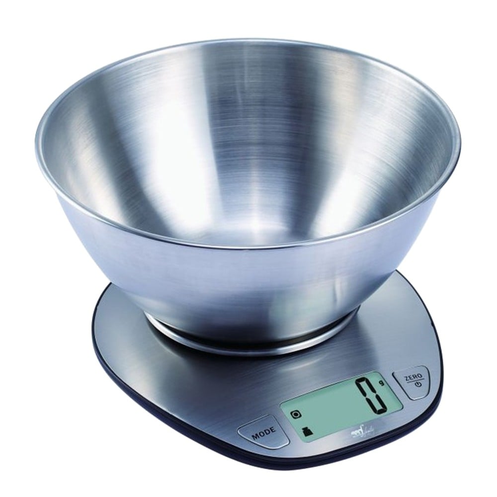 Kitchen scale with steel bowl Melchioni. High precision sensor. Container and body in steel. Large LCD display 58x27 mm. Volume measurement for water / milk / oil. Capacity: 5kg. Unit of measurement: gr/ml. Container volume 1.8L. Subdivision: 1g. Battery powered: 2 x AAA.