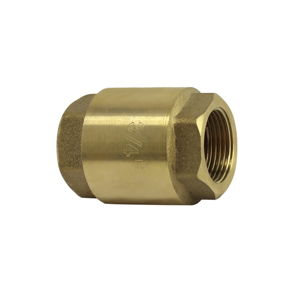 The brass check valve keeps prime in jet, submersible, and centrifugal pumps. When a pump shuts off, the check valve closes preventing the water from traveling back to the source. This check valve is constructed of heavy brass material.