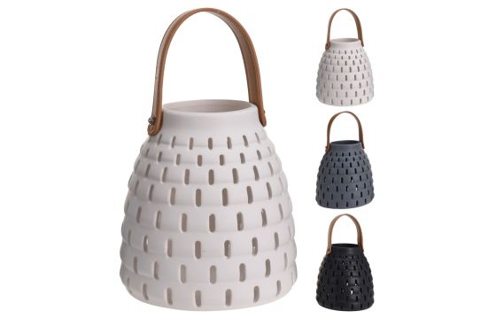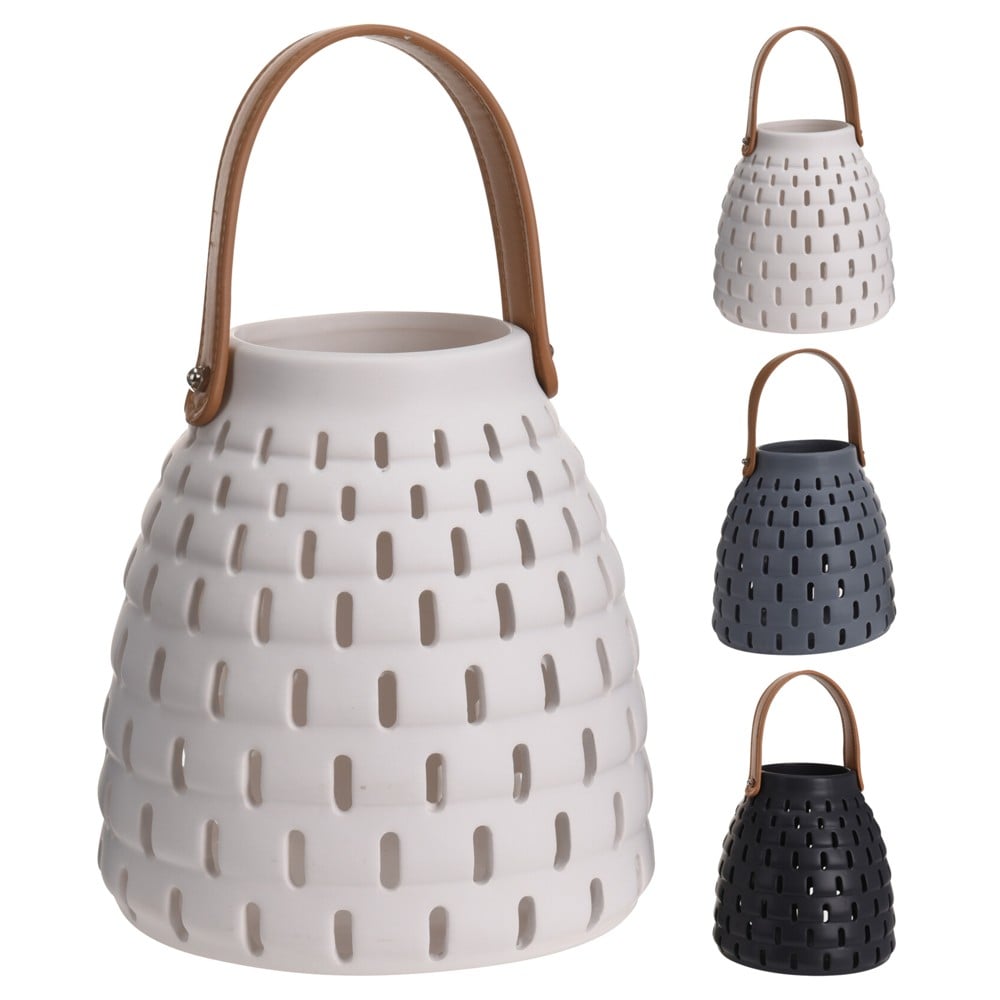 Lantern in white shade, which will decorate the terrace, balcony, garden or interior of the house. The original shape of the ecological lantern is sure to attract everyone's attention. The brown leather handle makes it easy to hold and allows you to hang it in the right place. It can also be placed on a shelf, table or floor. The ceramic lantern will bring a unique atmosphere to any room where it is placed. Through the small, elongated windows, it achieves the right amount of diffused light. Thanks to her, every evening will become magical. The candle holder can be an ideal gift for someone who likes to be surrounded by aesthetic objects. The lantern is also available in other colors.