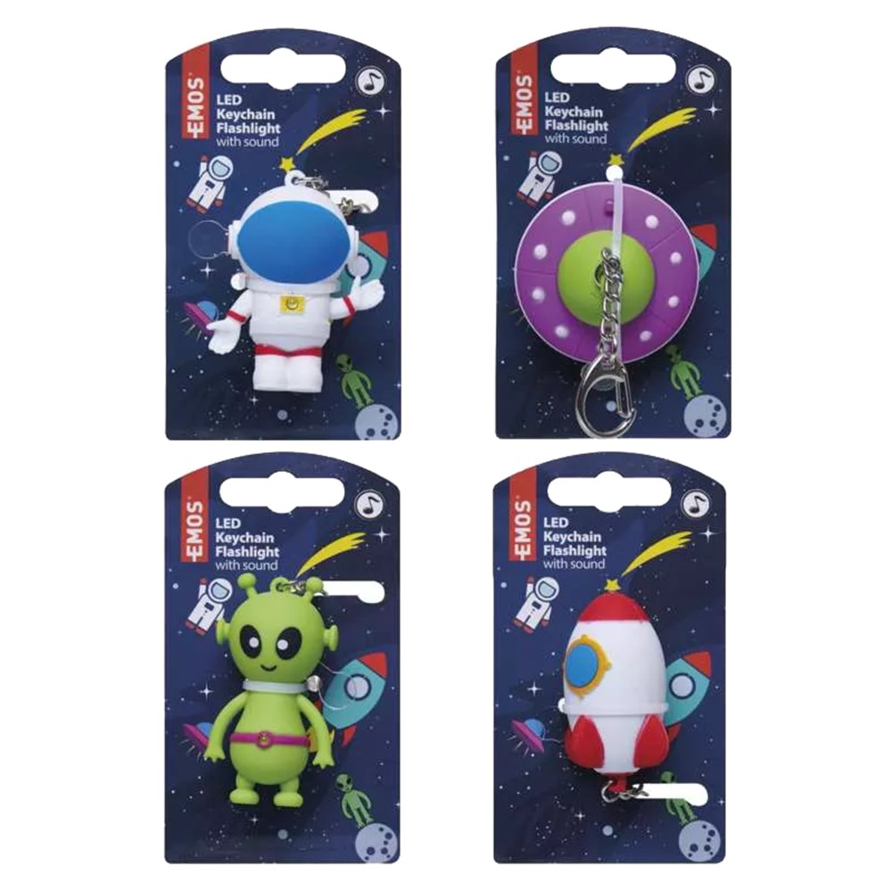 The LED keychain for children has a built-in LED that gives light up to 5 lumens. The presented key ring will be a great gift for a child, as well as a key pendant. The set includes three 1.5V LR54 batteries. The product is available in various forms from space, i.e. astronaut, alien, ufo ship, rocket.