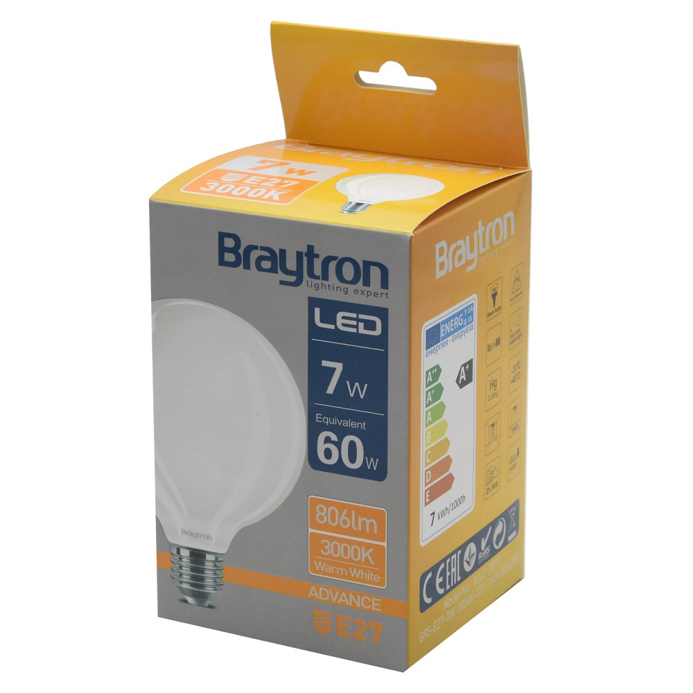 LED lamp BRAYTRON, E27, G95 7W, 3000K, 806lm, 220V-240V AC