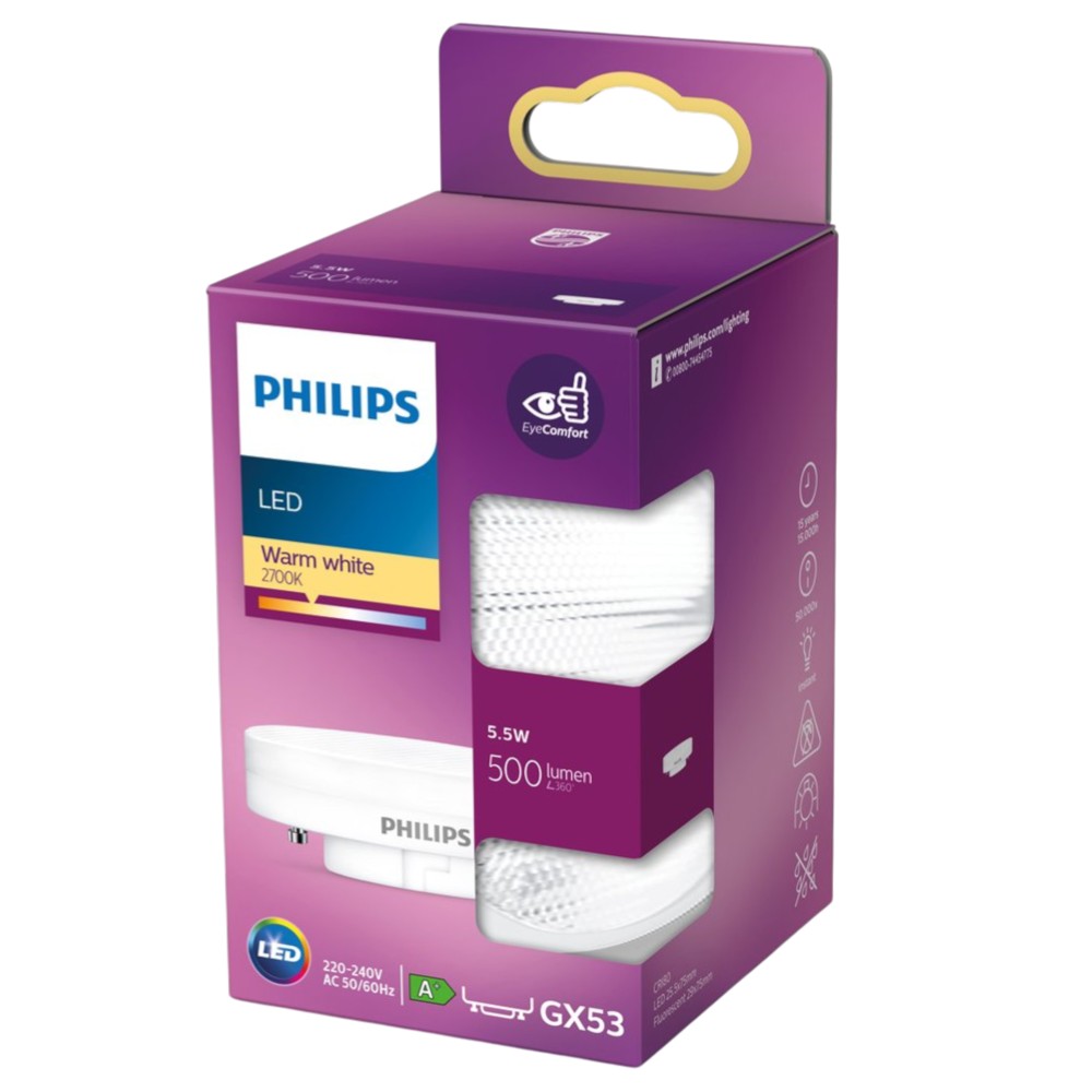 Philips 5.5W LED bulb with GX53 base, warm light 2700K and luminous flux 500 lumens. Provides pleasant and energy-efficient lighting, ideal for use in spotlights or integrated luminaires.